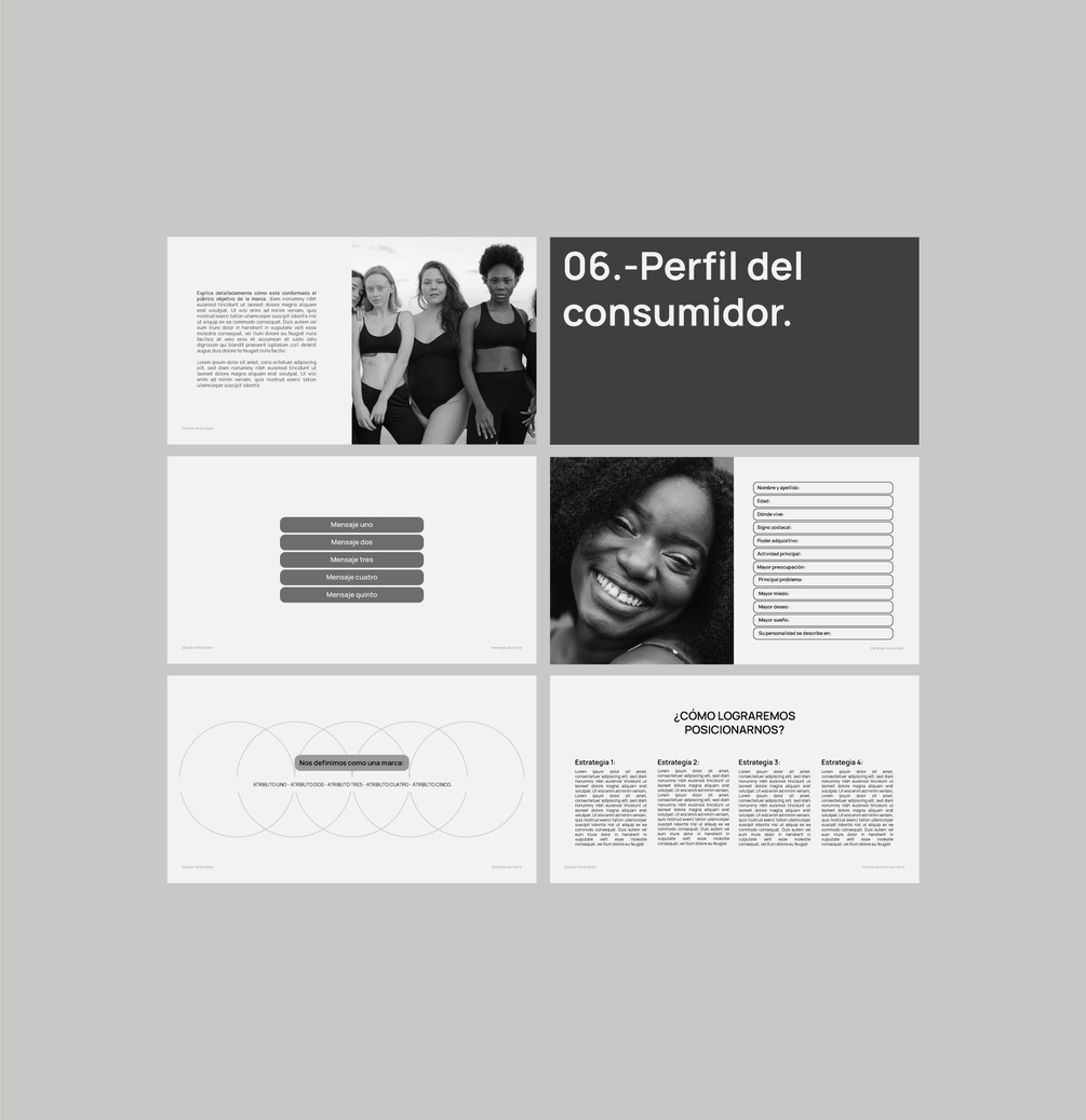 Tendrás a tu alcance una plantilla completamente real, de hecho, es la que usamos en el estudio para presentar la estrategia de marca a nuestros clientes.